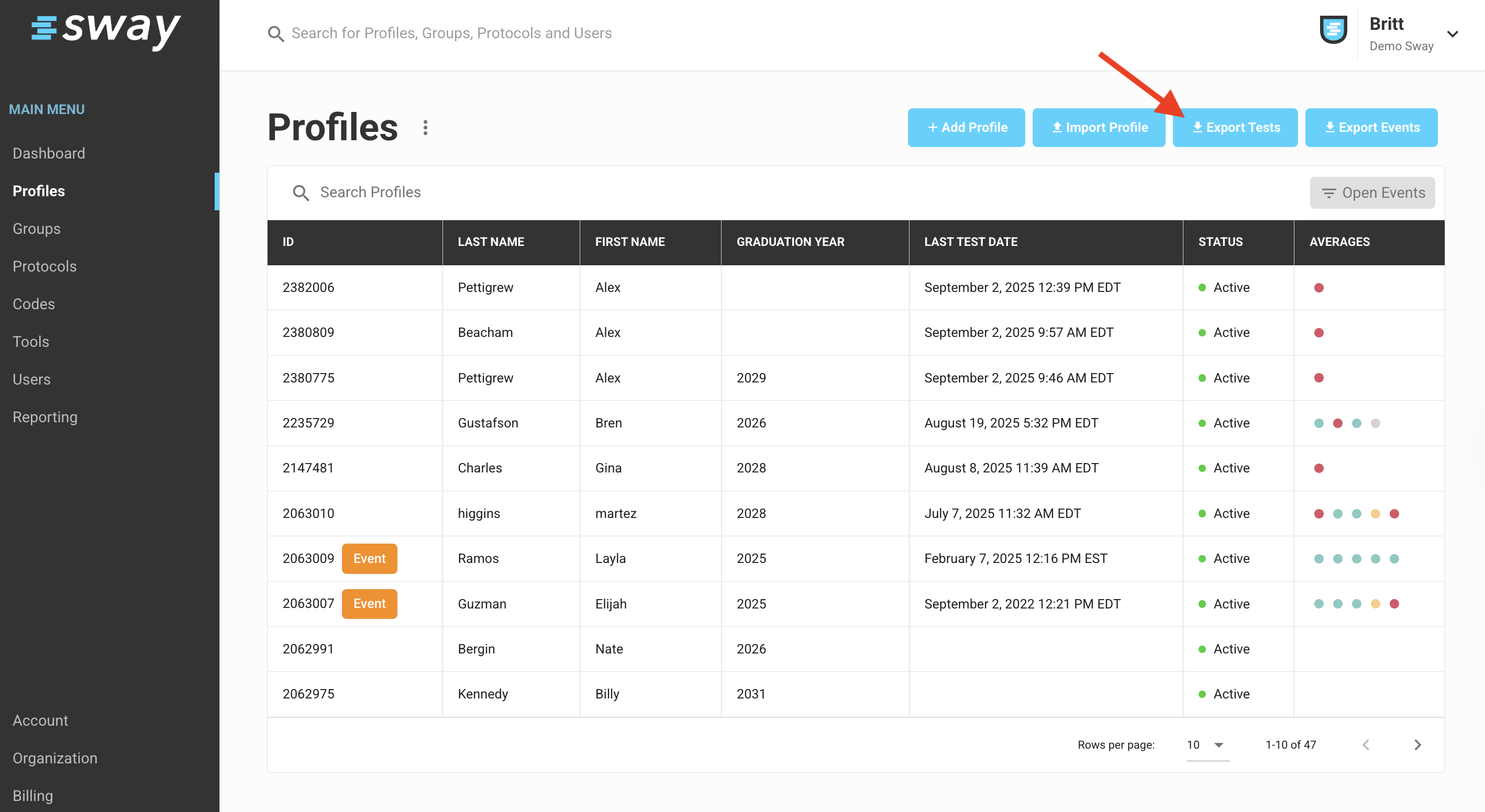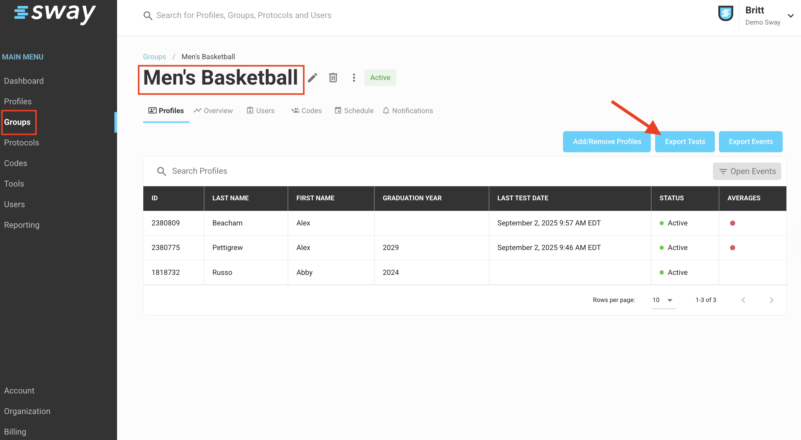 The Export Tests tool is available for both ALL PROFILES if steps are followed from the Profiles tab in the Sway web portal and from any specific GROUP based on how you would like to filter results.